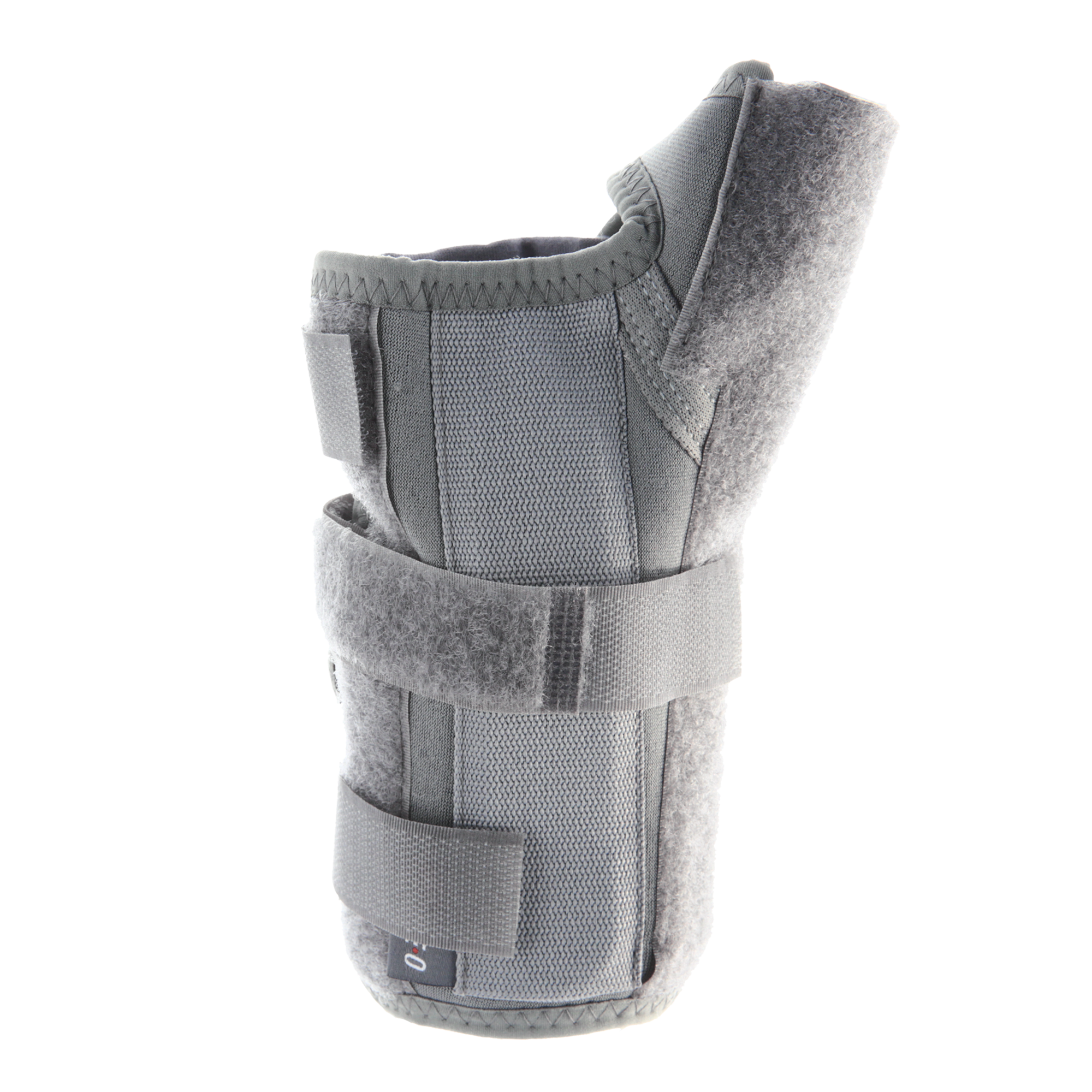 This product has a removable 6" palmar support and a removable 7" contoured aluminum thumb splint to help restrict wrist and thumb motions that may aggravate nerves, tendons, or ligaments. The adjustable thumb closure ensures desired thumb positioning and the adjustable wrist closures provide a custom fit. This product contours to the natural shape of the wrist and thumb for increased comfort and support. Specify left or right hand when ordering.